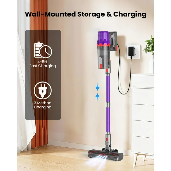 Una gran pantalla táctil LED muestra claramente la vida de la batería y la configuración del modo. El diseño autoportante te permite pausar la limpieza en cualquier lugar, y el soporte de pared incluido es compacto, fácil de almacenar y permite una carga conveniente.