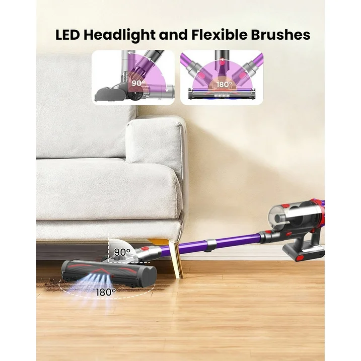 Para facilitar la búsqueda en esquinas oscuras y rastrear polvo, escombros y cabello debajo de los muebles, diseñamos cinco faros LED en el cepillo de piso. Para limpiar todas esas esquinas de difícil acceso debajo de los muebles y debajo de la cama y eliminar todo el polvo, también venimos con un cabezal de cepillo de piso flexible con giro lateral de 180° y giro hacia arriba y hacia abajo de 90° y una barra telescópica autoajustable. Haz que la limpieza sea más full y efectiva.