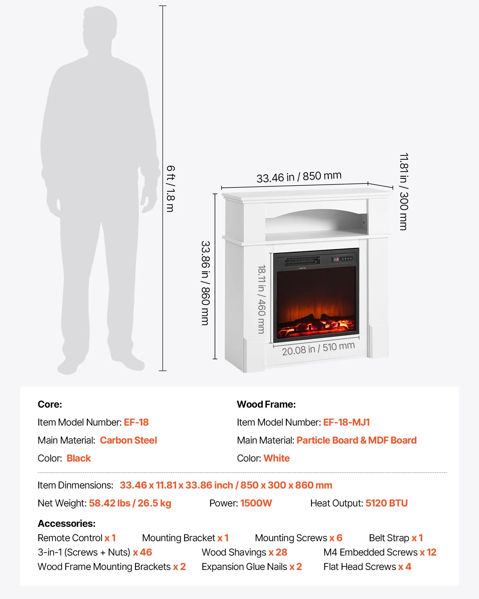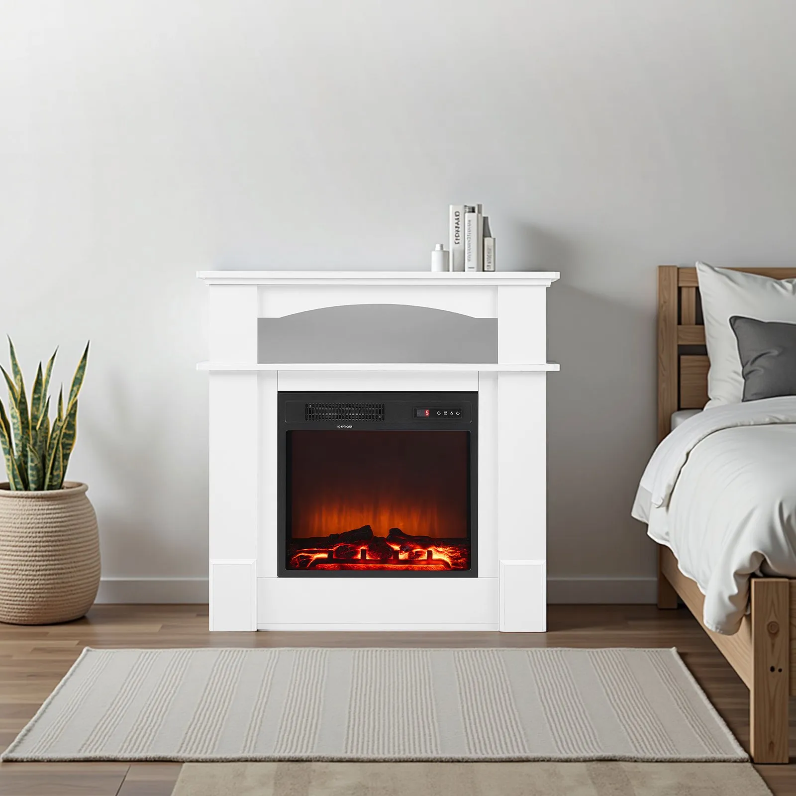 Chimeneas independientes VEVOR de 84 cm, 1500 W, 5120 BTU, estufa eléctrica de imitación con repisa, protección contra sobrecalentamiento, llamas ajustables, temporizador y control remoto, para sala de estar y dormitorio, color blanco