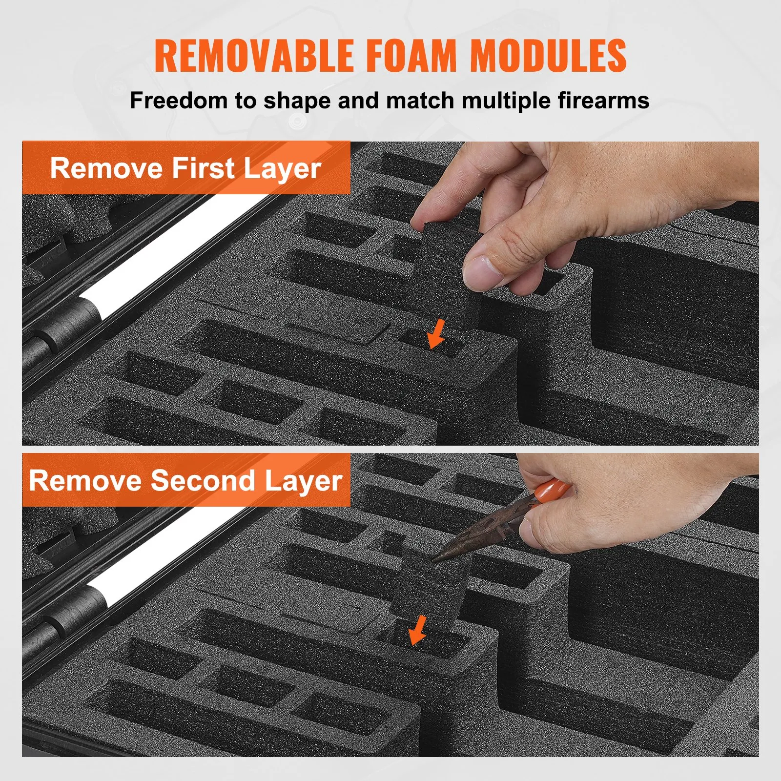 Módulo XPE versátil: Para garantizar un ajuste preciso con pistolas de varios tamaños, hemos integrado módulos XPE ajustables en altura y longitud. Esta característica garantiza que incluso las pistolas más pequeñas se ajusten perfectamente, como las de tamaño normal, lo que lo hace perfecto para guardar la mayoría de los modelos de pistolas y accesorios como gafas protectoras, fundas, guantes y munición, ofreciendo una solución ideal para almacenamiento y viajes.