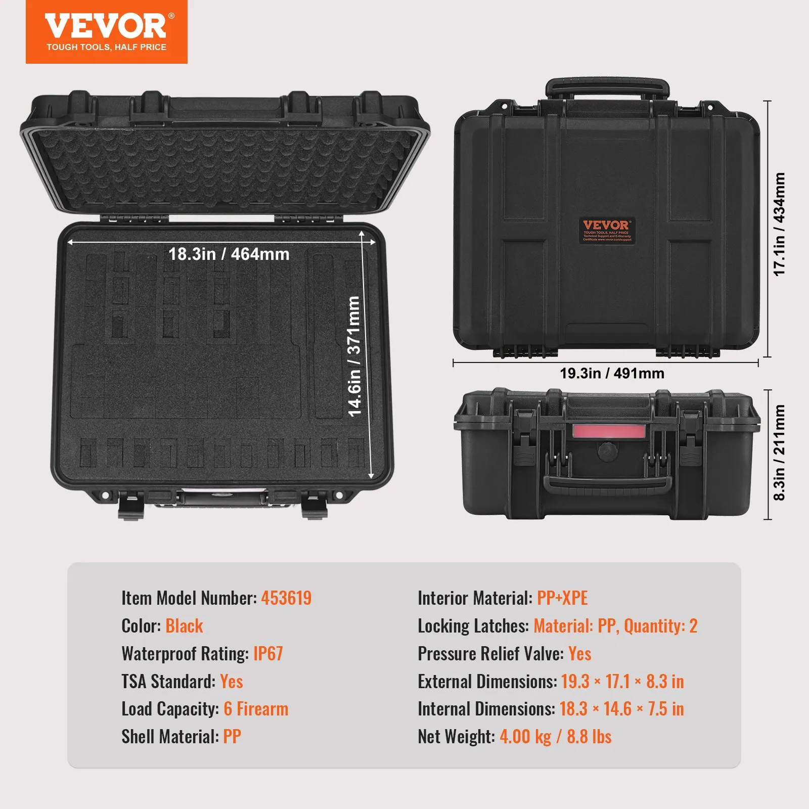 Estuches rígidos para pistolas con forro precortado, resistentes al agua y al polvo, para 6 pistolas, 49,5 x 43,1 x 21,5 cm, con cerradura, color negro