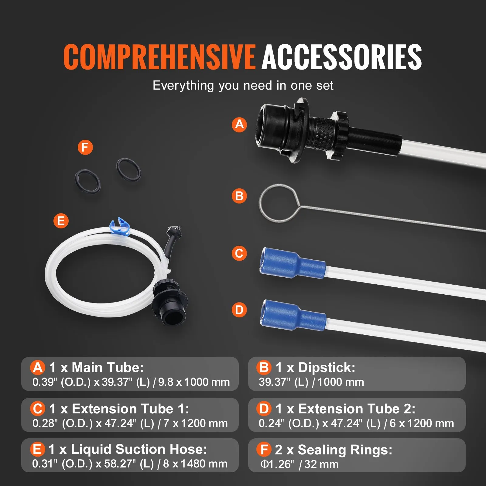 Kit Todo en Uno: Abra el paquete y encontrará un tesoro de herramientas: un tanque de 15 L (4 galones), un tubo principal, una varilla de nivel, dos tubos de extensión, una manguera de succión de líquidos, dos juntas tóricas y un manual de usuario para empezar. Esta bomba extractora de aceite permite extraer todo tipo de fluidos.