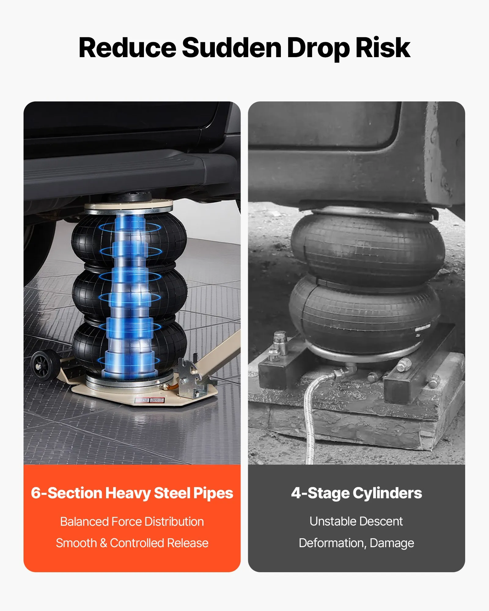 Descenso controlado y seguro: El gato neumático cuenta con seis tubos de acero reforzado en su interior, cada uno con una carrera más corta para un descenso suave y constante y un control preciso de la altura. Evita caídas bruscas, distribuye el peso de manera uniforme y previene deformaciones o inclinaciones.