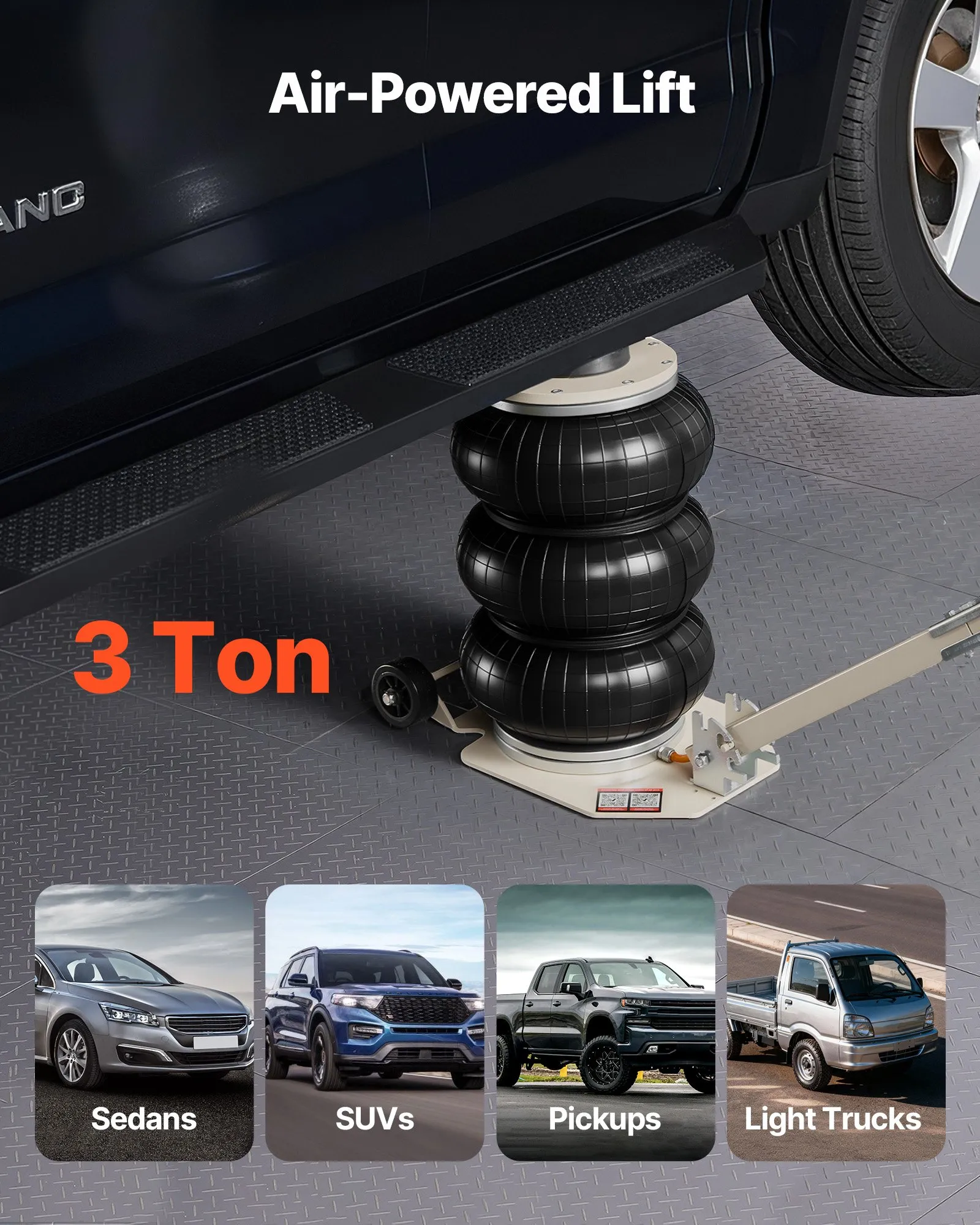 Capacidad de carga pesada de 3 toneladas: Este gato neumático soporta hasta 3 toneladas (6613 libras), ideal para sedanes, SUV, camionetas y camiones ligeros. Su bolsa de aire reforzada de triple capa y su placa base ensanchada garantizan un rendimiento de elevación fuerte y estable.