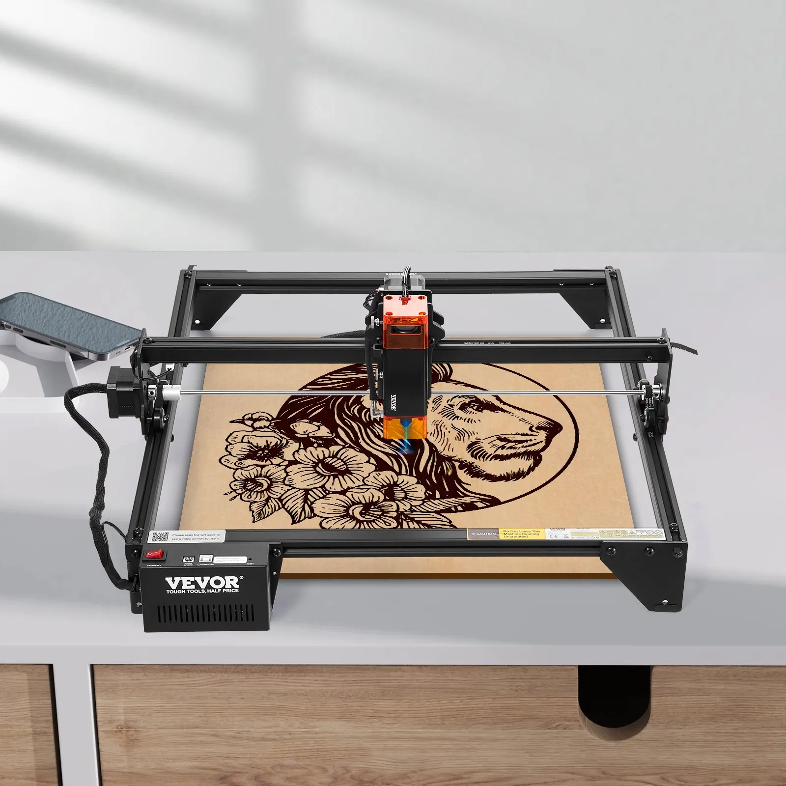 Diseñada pensando en usted: Nuestra máquina de grabado en madera cuenta con un interruptor de parada de emergencia integrado para garantizar su seguridad y tranquilidad durante el uso. El filtro protege sus ojos filtrando el 97 % de la luz dañina. El sistema de gestión de cables mantiene su espacio de trabajo organizado. Clase láser: 4; Potencia de salida: 10 W