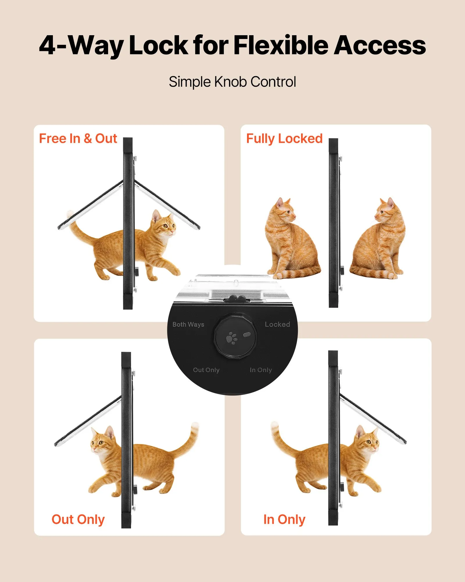 Sistema de bloqueo de 4 vías: Cambia entre modo de solo entrada, solo salida, acceso bidireccional o bloqueo total. Esta puerta para gatos con ventana de aluminio le brinda a tu gato flexibilidad de movimiento y ayuda a mantener un ambiente tranquilo en casa.
