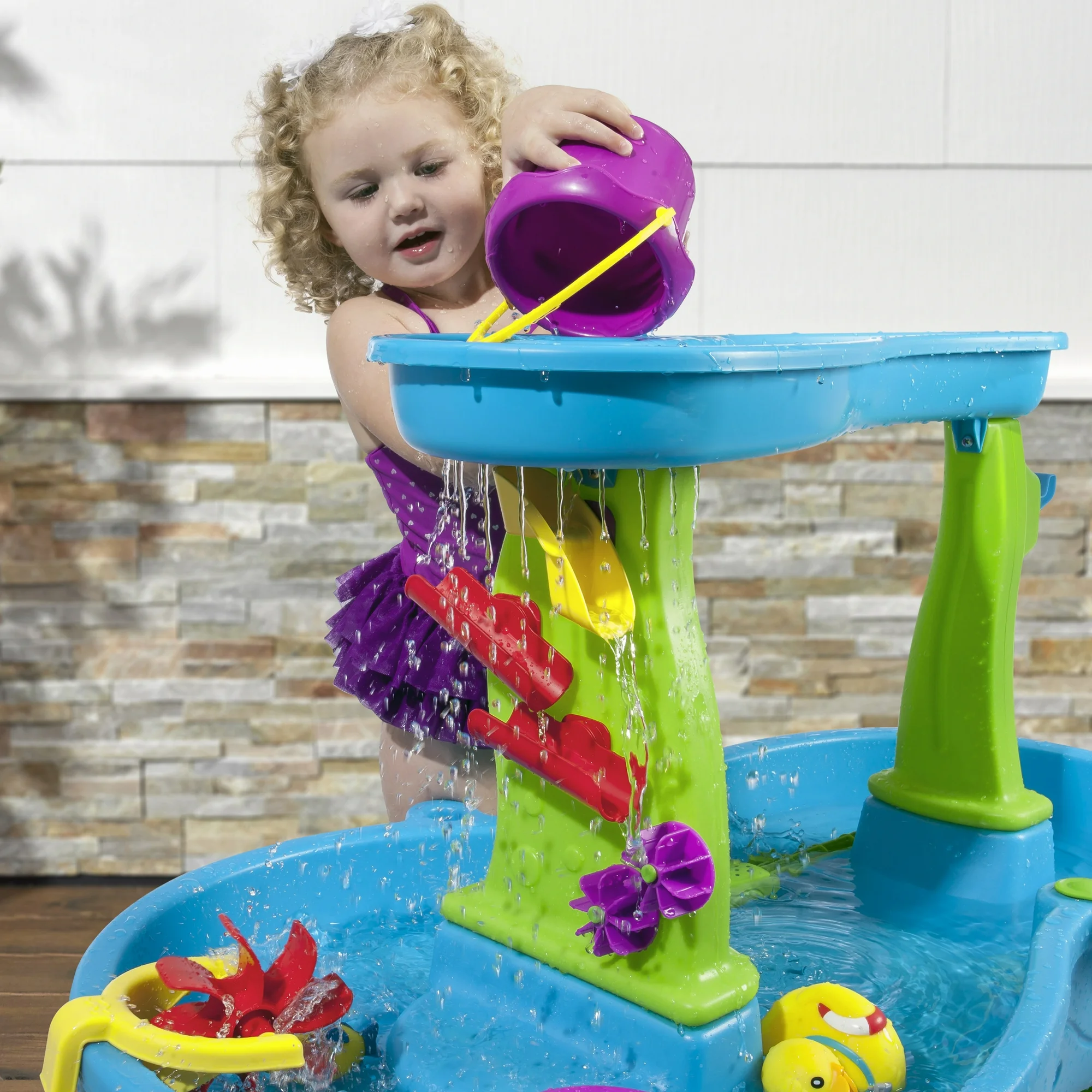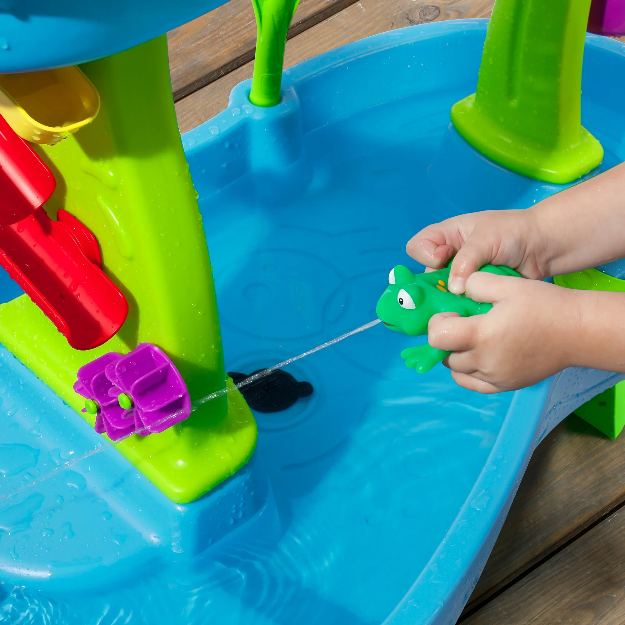Crea un mini parque acuático en tu patio trasero con Rain Showers Splash Pond Water TableTM de Step2 los juguetes perfectos para interiores o exteriores. El nivel de agua de dos niveles para niños pequeños diseñado para ser un juguete para niños fuera. ¡Crea una lluvia de salpicaduras abajo! Simplemente recoge el agua del estanque y vierte en la bandeja superior para que llueva. Observa cómo una ducha de lluvia vuelve a entrar en el estanque y activa los giros, cubos y rampas en forma de laberinto, una excelente manera de mostrar una relación de causa y efecto y promover el juego STEM mientras usas la tabla de actividad de agua de Rain Shower. Desde la aleta lateral hasta las piezas de laberinto de poner y colocar, los niños tendrán mucha diversión con el conjunto de accesorios de 13 piezas incluido que mejora su experiencia de juego en el agua. Esta mesa de juegos de agua Step2 para niños tiene un agujero moldeado en la parte posterior de la mesa que puede acomodar y sombrilla y un tapón de drenaje para facilitar la eliminación del agua cuando el tiempo de juego haya terminado. Lo mejor de todo es que con el logotipo Step2 ubicado en la base de este juguete acuático, sabes que esta mesa de juego al aire libre fue construida para durar, hecha con plásticos resistentes y viene con una garantía limitada. Este juguete para niños al aire libre mantendrá a su niño chapoteando durante horas!. Asamblea de adultos requerida.