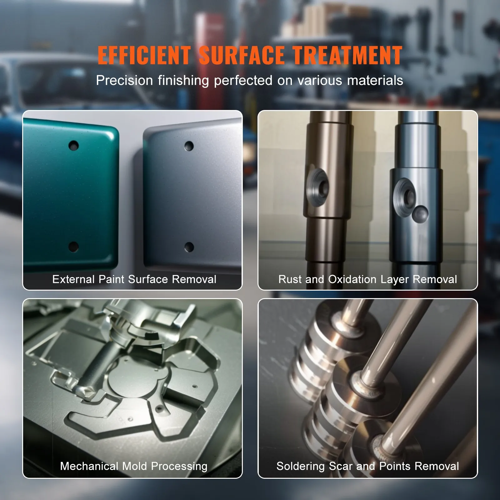 El kit de chorro de arena VEVOR es versátil para una amplia gama de tratamientos de superficies en diversos materiales. Desde la eliminación de óxido y capas de oxidación hasta el desbarbado, el suavizado de bordes, la restauración de piezas viejas y el grabado con chorro de arena, satisface diversas necesidades con precisión y facilidad.