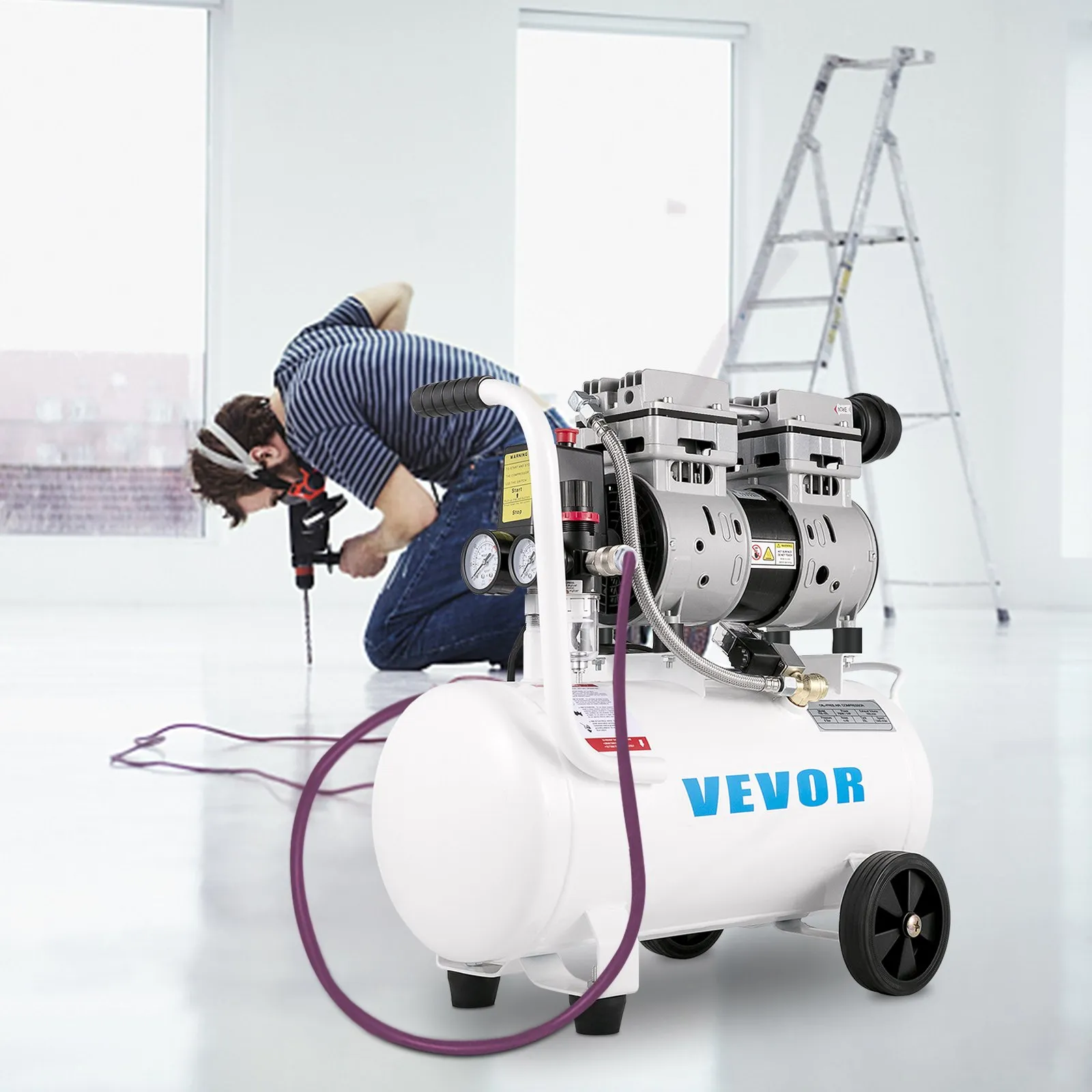 Este compresor de aire se puede utilizar ampliamente para diversas herramientas neumáticas, como taladros, clavadoras, pistolas de calafateo, llaves neumáticas, etc. Está equipado con 1 bomba sin aceite para un mantenimiento mínimo y 1 tanque de 25 L para un funcionamiento continuo. Además, el compresor cuenta con 1 motor de cobre puro, de alta eficiencia y ultra silencioso, que le sirve durante mucho tiempo.